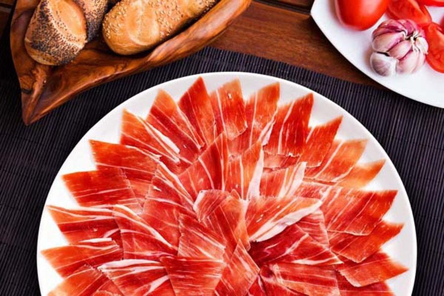 上等的西班牙伊比利亞火腿的吃法就是切薄片生吃,現(xiàn)切現(xiàn)吃?;鹜仁秤脮r(shí),好將切片放在一個(gè)碟子上,但不要裝得過滿,選不同部位的火腿以體驗(yàn)不同的味道。將肉切成幾乎是半透明的薄片后,味道更佳。一片好的切片應(yīng)保持火腿的味道和香氣不變。