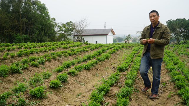 西彭鎮(zhèn)新民村,金稼洞生態(tài)農(nóng)業(yè)專業(yè)合作社理事長楊德元正在田間查看枸杞芽菜長勢 。