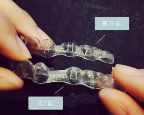 因為她的工作需求,所以自己覺得不適合戴鋼絲牙套。于是專家建議她做隱形矯正,這是她矯正之前用的隱形牙套。前后對比能看出牙套的輪廓都變得整齊自然了。
