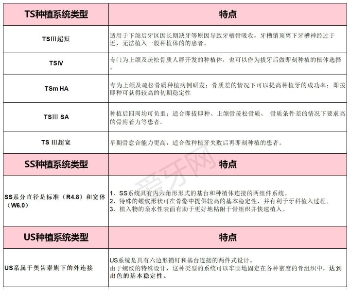 目前奧齒泰種植體旗下有三個系列,分別是常用的GS/TS系列,SS系列,US系列。這里給大家先簡單總結一下這三個系列的區(qū)別: