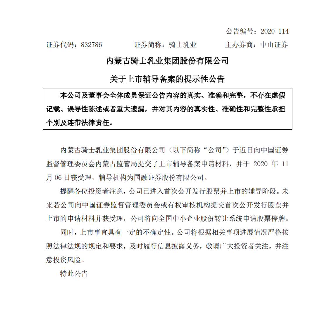 近期,新三板掛牌乳企內(nèi)蒙古騎士乳業(yè)集團(tuán)股份有限公司(簡(jiǎn)稱“騎士乳業(yè)”)向內(nèi)蒙古監(jiān)管局提交上市輔導(dǎo)備案申請(qǐng)材料并獲受理。在生鮮乳供應(yīng)緊張、奶價(jià)不斷上漲、乳業(yè)上游投資并購(gòu)活躍的背景下,業(yè)內(nèi)認(rèn)為,騎士乳業(yè)選擇此時(shí)上市將迎來(lái)市場(chǎng)與政策環(huán)境的利好。