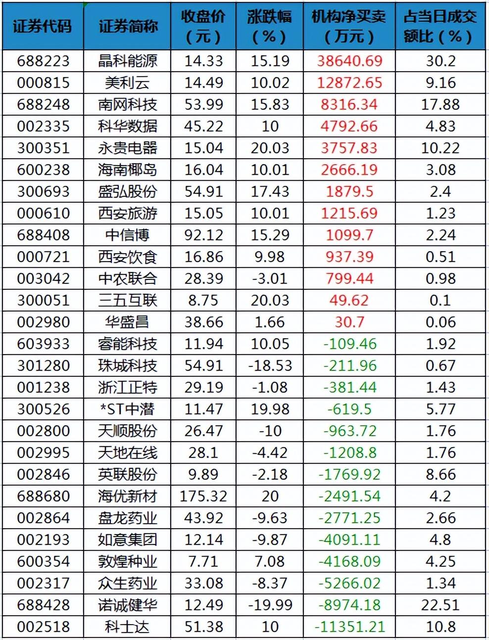 盤后龍虎榜數(shù)據(jù)顯示,周一機構(gòu)席位資金合計凈買入約3.27億元。其中,凈買入的個股13只,凈賣出的個股14只。機構(gòu)凈買入多的股票是晶科能源,凈買入金額約3.86億元;機構(gòu)凈買入居前的還有美利云、南網(wǎng)科技、科華數(shù)據(jù)等股。機構(gòu)凈賣出多的股票是科士達,凈賣出金額約1.14億元;機構(gòu)凈賣出居前的還有諾誠健華、眾生藥業(yè)、敦煌種業(yè)等股。