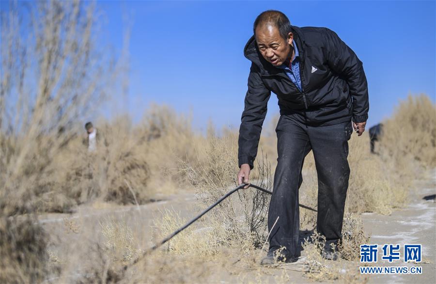 新疆且末縣防風(fēng)治沙站副站長佟戈雁在治沙現(xiàn)場查看滴灌管道的維護(hù)情況(11月15日攝)。新華社記者 王菲 攝