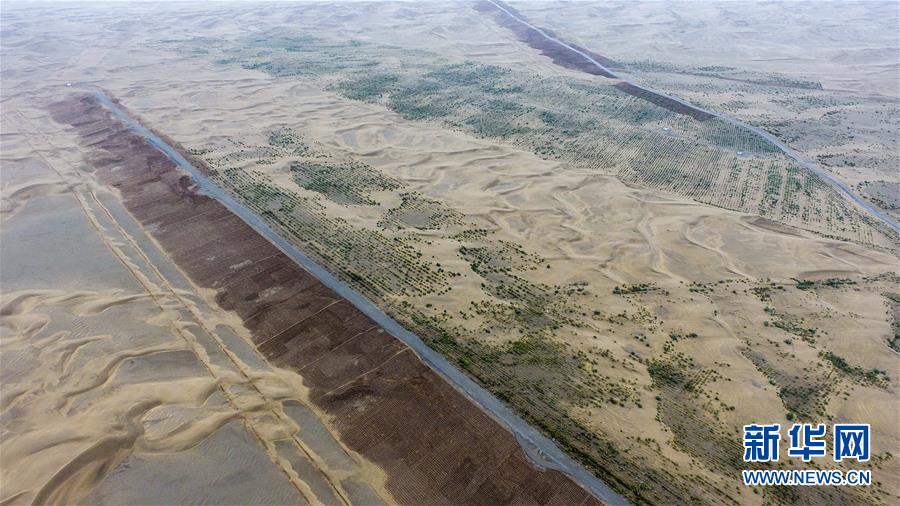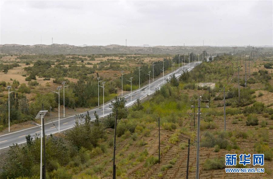 在新疆且末縣車爾臣河以東的防沙治沙綠色長廊,一條柏油路從沙漠中延伸,道路兩側(cè)綠意盎然(8月21日攝)。新華社記者 趙戈攝