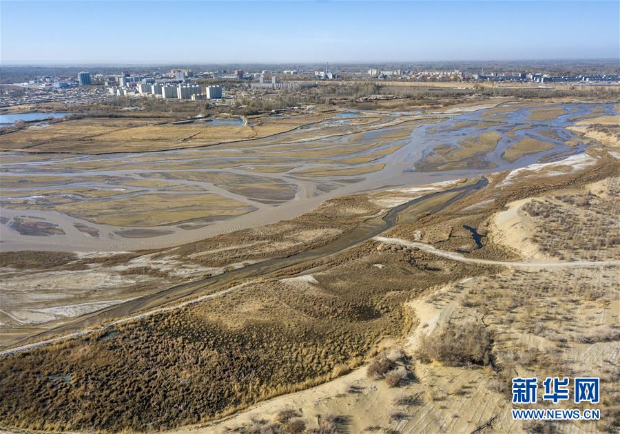 從空中俯瞰位于新疆且末縣境內(nèi)的車爾臣河,以及河?xùn)|的防沙治沙綠色長廊與河西的縣城樓宇(11月15日無人機(jī)拍攝)。新華社記者王菲 攝