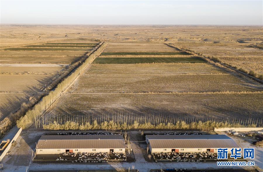 從空中俯瞰蔡振峰家的羊圈和田地,遠(yuǎn)處可看到成片的沙漠(11月15日無人機(jī)拍攝)。新華社記者 王菲 攝