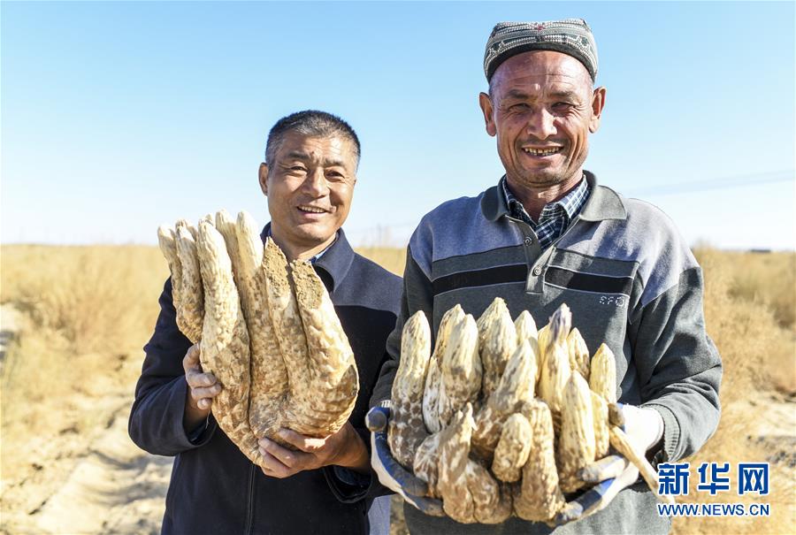 徐寧(左)與新疆且末縣英吾斯塘鄉(xiāng)65歲的村民阿里木·穆沙展示剛剛采挖出來的肉蓯蓉(11月15日攝)。新華社記者 王菲攝