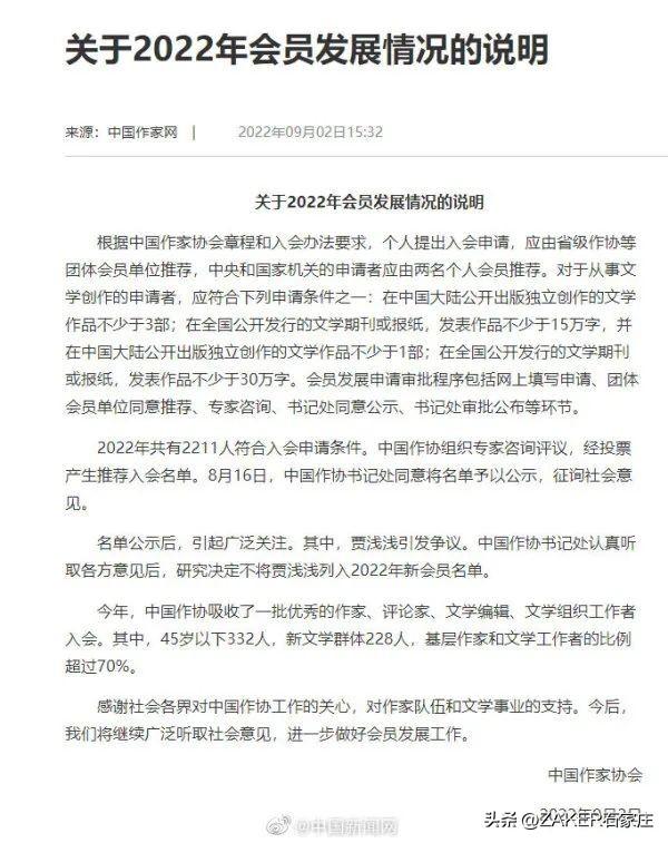 · 中國作家協(xié)會:決定不將賈淺淺列入2022年新會員名單