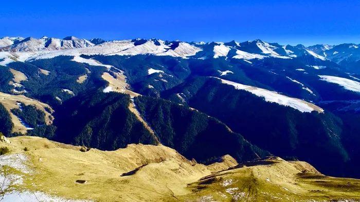 藍天的背景過于藍了,雪山連亙不絕地在其上雕琢出精致的山痕,直至藍天的盡頭。雪峰瑩瑩,也被天之藍慷慨地映出了藍意。山間峽谷被云杉的墨綠擁塞了,挺秀的樹形蜿蜒地延伸,直至難辨樹形的深綠林帶。云杉林由峽谷漫上雪山腋窩凹處,把綠色鋪展上雪原。峽谷里傳來一聲馬的嘶鳴,有牧民在谷里放牧,牧草收獲后牧民就可以進入冬牧了。雪原上馬行的印跡拉出了一道道細線,橫豎交織,如飄逸的發(fā)絲。雪地上一片片翻起的黑土,“那是野豬拱出的?!蹦贻p的牧民兀拉提說。