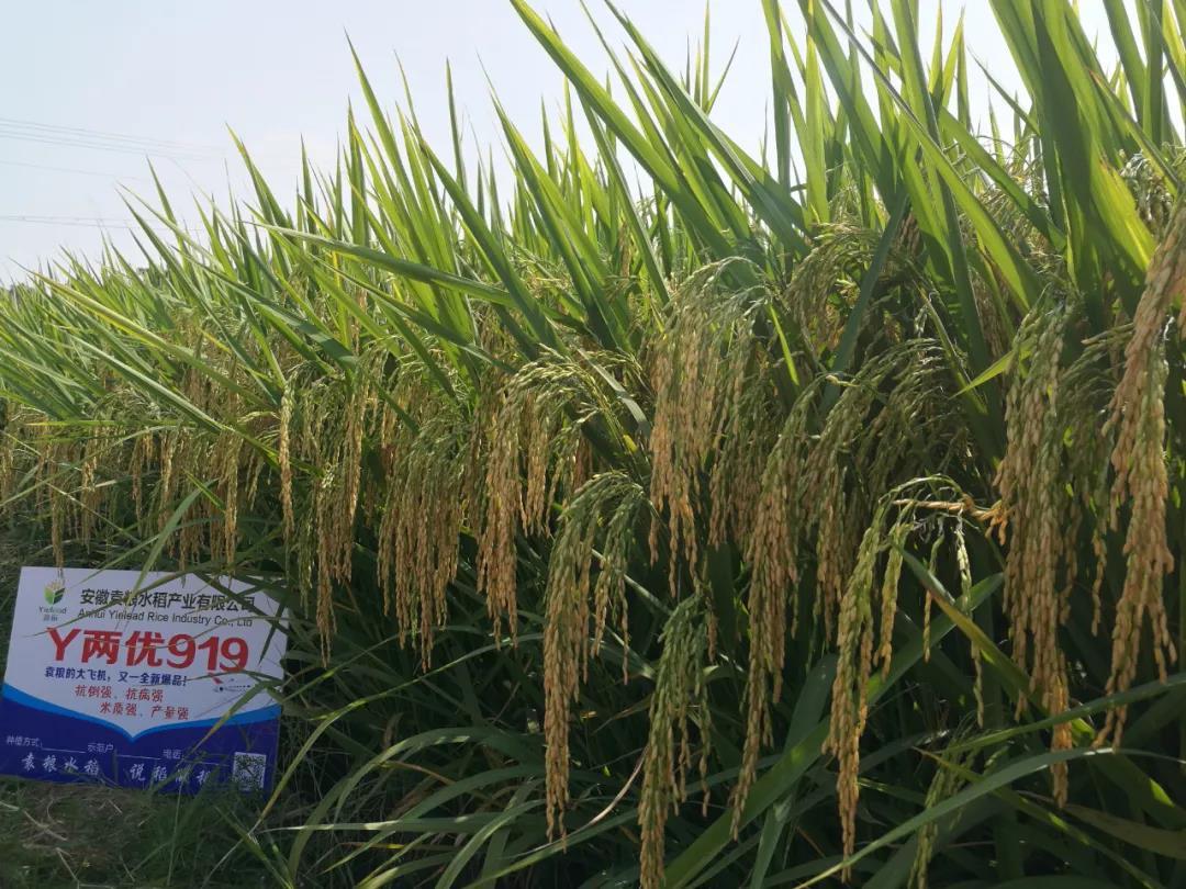 Y兩優(yōu)919特征特性Y兩優(yōu)919系秈型兩系雜交水稻品種,抗倒、高產(chǎn),適宜長江中下游作一季中稻直播種植。全生育期兩年區(qū)試平均138.4天,比豐兩優(yōu)四號(CK)遲熟4.3天。主要農(nóng)藝性狀表現(xiàn):每畝有穗數(shù)16.7萬,株高123.7厘米,穗長27.7厘米,每穗總粒數(shù)201.4粒,結(jié)實率84.2%,千粒重24.6克??剐员憩F(xiàn):稻瘟病綜合指數(shù)年度分別為5.0級、4.3級,穗瘟損失率高級7級;白葉枯病5 級;抽穗期耐熱性3級。米質(zhì)表現(xiàn):糙米率 80.3%,精米率 73.4%,整精米率 70.3%,粒長 6.3mm,長寬比3.0,堊白粒率7%,堊白度0.6%,透明度2級,堿消值5.0級,膠稠度78mm,直鏈淀粉含量13.8%,綜合評級為優(yōu)質(zhì)3級。