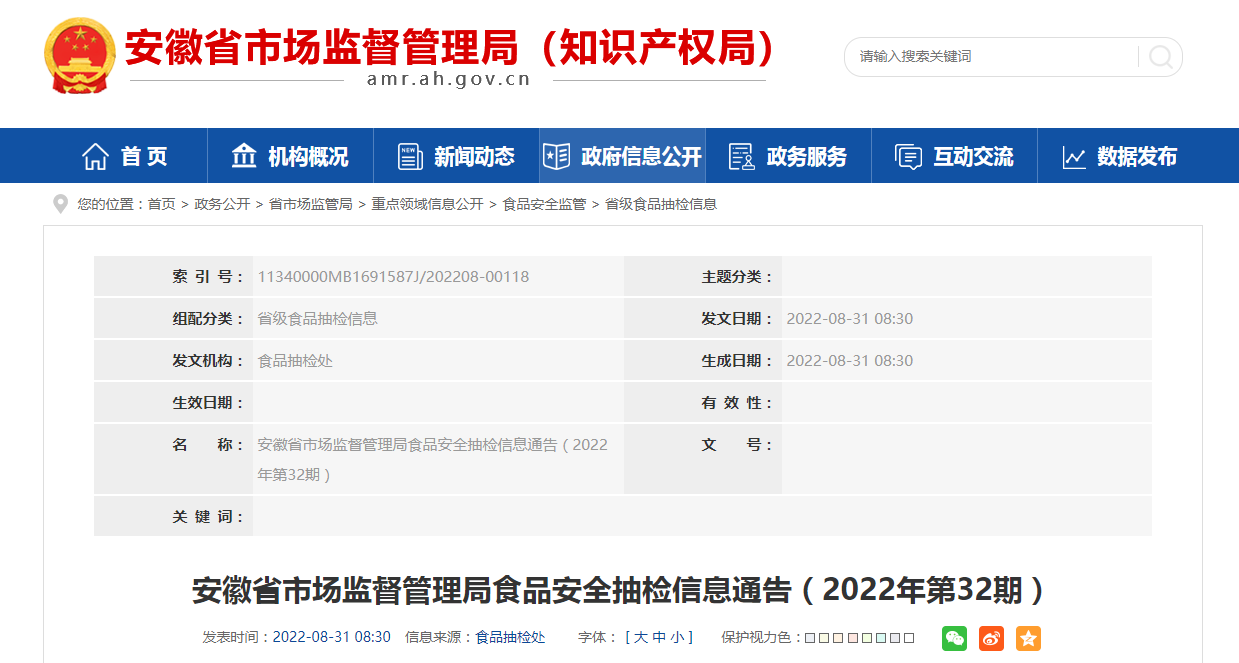 中國質(zhì)量新聞網(wǎng)訊 8月31日,安徽省市場監(jiān)督管理局網(wǎng)站發(fā)布食品抽檢信息通告(2022年第32期)。