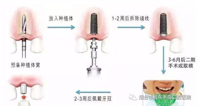 初次檢查,制定手術方案,預約手術時間——一期種植手術——一至兩周后拆除縫線——3至6個月后二期手術(此步驟的有無根據(jù)具體情況而定)——制取印?!?至3周后戴牙——定期復查