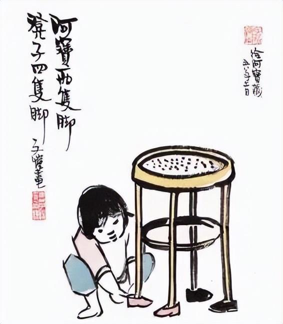 他畫(huà)女兒阿寶,把鞋子脫下來(lái)穿在凳子上,假裝“凳子有四只腳”;