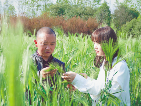 農(nóng)業(yè)職業(yè)經(jīng)理人王伶俐(右)在田間查看農(nóng)作物長勢