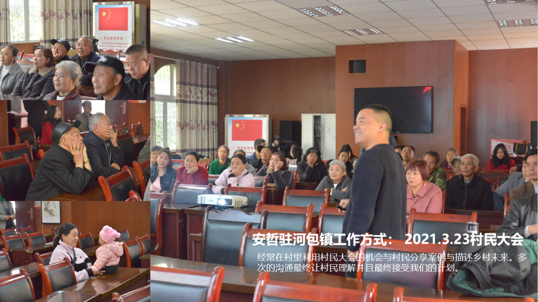 開始確實是很不愉快,甚至?xí)庥龈鞣N謾罵,但是我們很有方法,后村民們總是能夠完全信任和理解我們。我們會跟他們同吃同住、持續(xù)地交流、開村民大會,關(guān)系有所緩和以后,我們也會跟著他們到各處參觀……慢慢地,他們就會知道,這個團(tuán)隊是真的想把這個事情做成。在這個過程中,我們需要一戶一戶地做溝通工作。村民們都比較保守,即便我們已經(jīng)使大部分人都不再強烈地反對,也很難得到村民在公開場合的表態(tài)支持。因此,小范圍的溝通才能夠讓我們傾聽到村民們真實的想法和需求,一點一點地取得信任,然后慢慢再把小范圍的認(rèn)同擴(kuò)大成一個片區(qū)的支持。