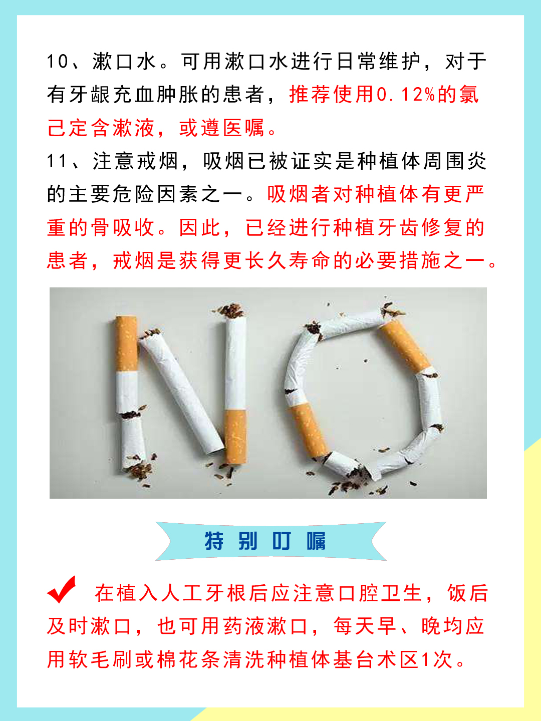 3??在植入人工牙根后應注意口腔衛(wèi)生,飯后及時漱口,也可用藥液漱口,每天早、晚均應用軟毛刷或棉花條清洗種植體基臺術區(qū)1次。