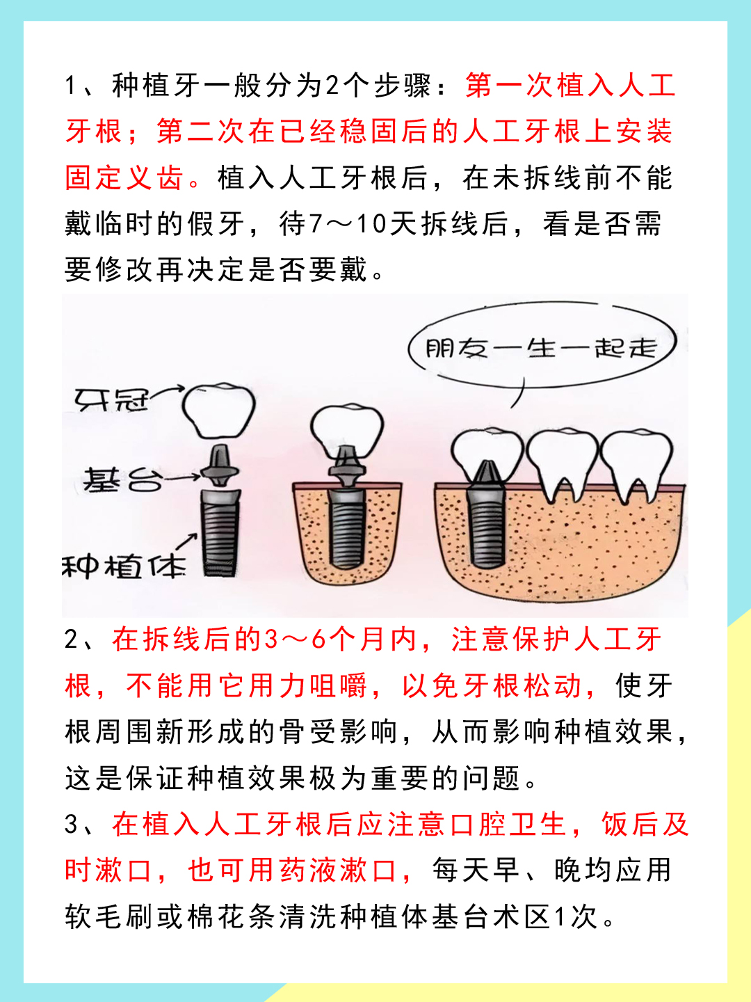注意保護人工牙根,不能用它用力咀嚼,以免牙根松動,使牙根周圍新形成的骨受影響,從而影響種植果。這是種植果極為重要的問題。