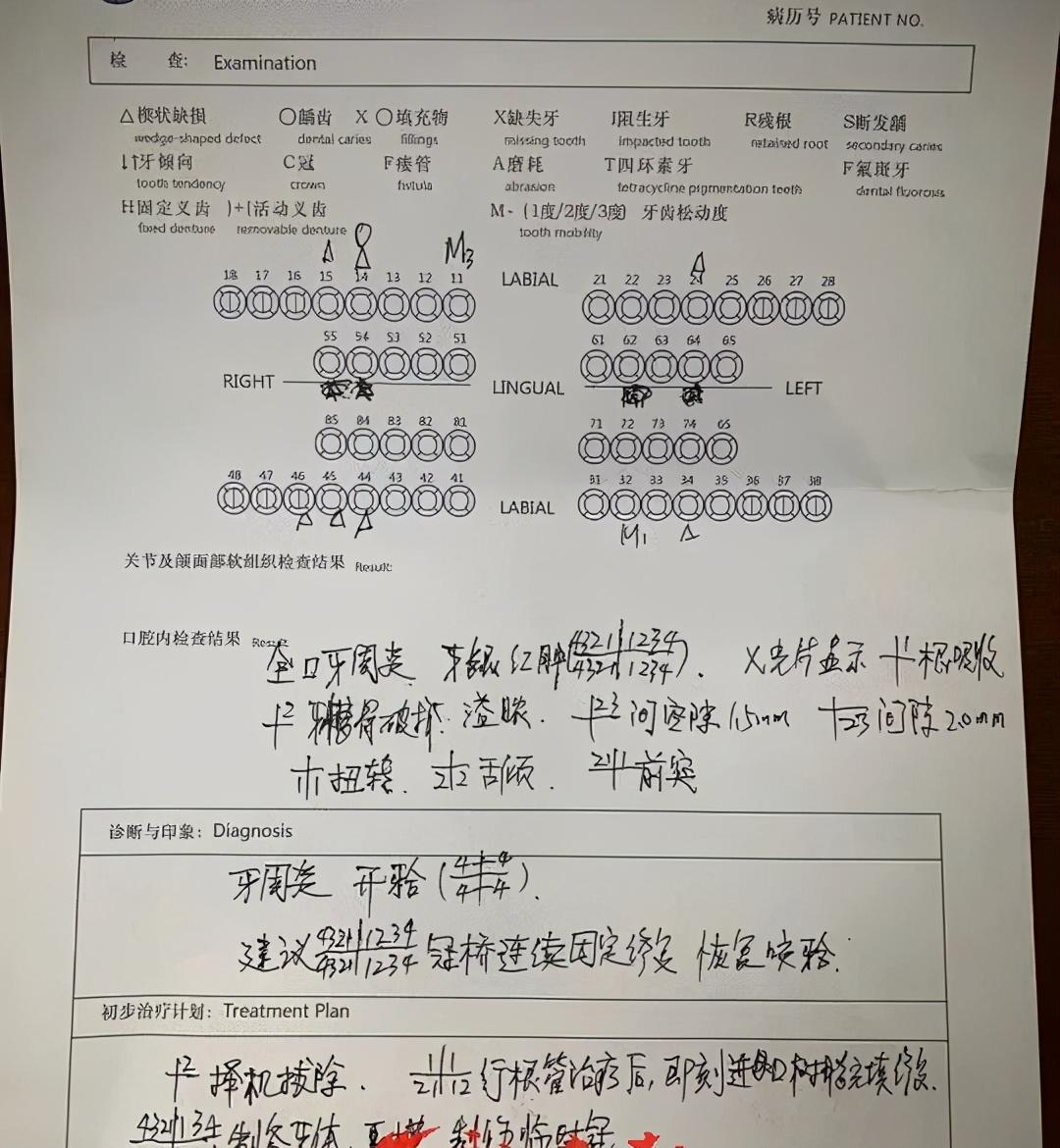 李大夫向新時(shí)報(bào)記者出具一份正反頁(yè)打印的口腔病歷。在口腔病例正面“就診內(nèi)容”一欄里,“鑲牙、牙齒美容、牙齒松動(dòng)”這三項(xiàng)被打了勾,患者簽名一欄也有靳先生的名字。病歷反面則有完整的檢查、診斷與初步調(diào)節(jié)計(jì)劃等內(nèi)容,其中寫有“建議16顆牙齒冠橋連續(xù)固定修復(fù)、制備牙體、制作臨時(shí)冠”等字樣?!斑@份口腔病歷是當(dāng)著他面填寫的,上面也有他自己的簽名,他不同意的話我們?cè)趺纯赡茏???/span>