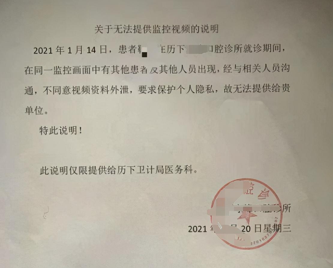 診療當(dāng)天究竟發(fā)生了什么?新時(shí)報(bào)記者致電歷下區(qū)衛(wèi)計(jì)局醫(yī)政科了解情況。醫(yī)政科一位負(fù)責(zé)人表示,針對(duì)這起糾紛醫(yī)政科已經(jīng)調(diào)解過兩次了,由于診所拒絕提供事發(fā)當(dāng)天的監(jiān)控錄像,無(wú)法證實(shí)術(shù)前有沒有做好充分告知義務(wù),因此調(diào)解未能成功。某口腔診所跟醫(yī)政科出具了一份《關(guān)于無(wú)法提供監(jiān)控視頻的說(shuō)明》,上面寫道:“患者靳先生就診期間,在同一監(jiān)控畫面中有其他患者及他人人員出現(xiàn),經(jīng)與相關(guān)人員溝通,不同意視頻資料外泄,要求保護(hù)個(gè)人隱私,故無(wú)法提供給貴單位。”靳先生則認(rèn)為,某口腔診所不敢拿出監(jiān)控視頻,是因?yàn)楫?dāng)時(shí)雙方啥也沒簽,監(jiān)控視頻能證明誰(shuí)在撒謊。