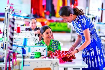 在和田地區(qū)洛浦縣洛浦鎮(zhèn)一家服裝公司內(nèi),負(fù)責(zé)人阿孜古麗·多來提(右)給員工講解艾德萊斯服裝制衣的技巧。買買提艾力·艾尼瓦爾攝/光明圖片