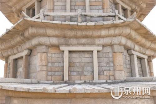 萬(wàn)壽塔與開(kāi)元寺雙塔、六勝塔一樣采用平面八角形設(shè)計(jì),不僅使得看似笨重的花崗巖石組成的形態(tài)顯得勻稱(chēng)柔美,而且在結(jié)構(gòu)穩(wěn)定性方面得到基本的。為了加強(qiáng)塔體重心的穩(wěn)定性,采取塔身逐層收分和每層門(mén)龕錯(cuò)位的做法,使塔身壓力向八個(gè)邊線(xiàn)的垂直面平均分散。