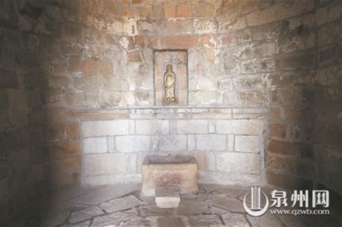 記者從山門(mén)遙望頂峰,只見(jiàn)一座石塔巍然矗立仿佛直入云霄,幾段石階開(kāi)鑿于山巖之間,兩側(cè)皆是巖石,頗為陡峭。待攀上山頂,極目遠(yuǎn)眺,便可見(jiàn)遠(yuǎn)處的海灣波光粼粼,四周景色盡收眼底,一覽無(wú)余?;赝f(wàn)壽塔,石塔整體宛若閣樓,由花崗巖筑成,共五層,呈八邊形。一層石門(mén)洞開(kāi),兩側(cè)石柱鐫刻有“勝地有緣方可進(jìn) 名山無(wú)福不能游”的對(duì)聯(lián),橫匾即 “泉南勝地”四字。門(mén)外還立有幾方石碑,記錄著萬(wàn)壽塔的歷史?!度莞尽酚休d:“關(guān)鎖水口鎮(zhèn)塔也,高出云表,登之可望商舶來(lái)往?!笨梢?jiàn)萬(wàn)壽塔自古便是重要航標(biāo),亦被稱(chēng)為關(guān)鎖塔。走進(jìn)塔內(nèi),立即感到一陣清涼舒爽,原來(lái)萬(wàn)壽塔內(nèi)部呈空心樓閣狀,內(nèi)外溫差頗大,是天然的避暑勝地。