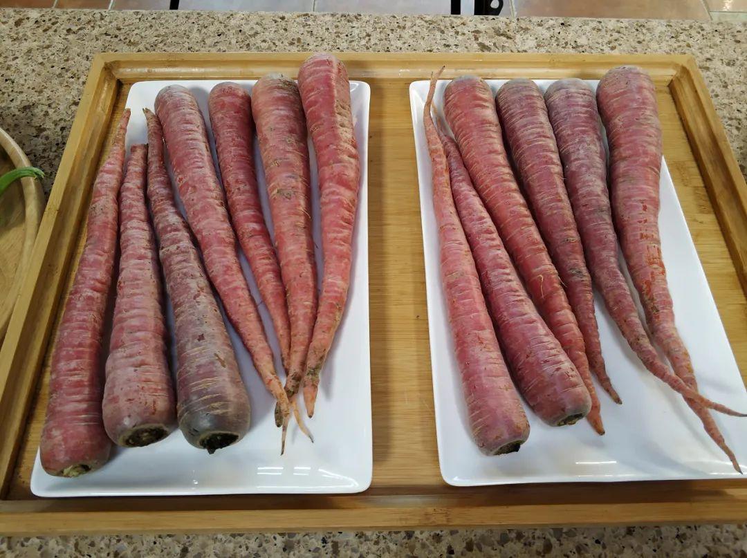 “鞭桿紅”胡蘿卜風味濃,味甜,肉質脆硬,品質好,其胡蘿卜素、花青素含量比普通品種高,是有益于身體健康的保健型蔬菜。生熟食均可,適宜炒食、燉食、蒸食和腌制以及涼拌,烹飪方法得當能體現其營養(yǎng)價值和風味,豐產性好。適宜秋季露地栽培,耐貯藏,在窖中能貯存到來年3月份。每年11月-來年3月供應市場,深受各階層消費者的喜食。品種特性