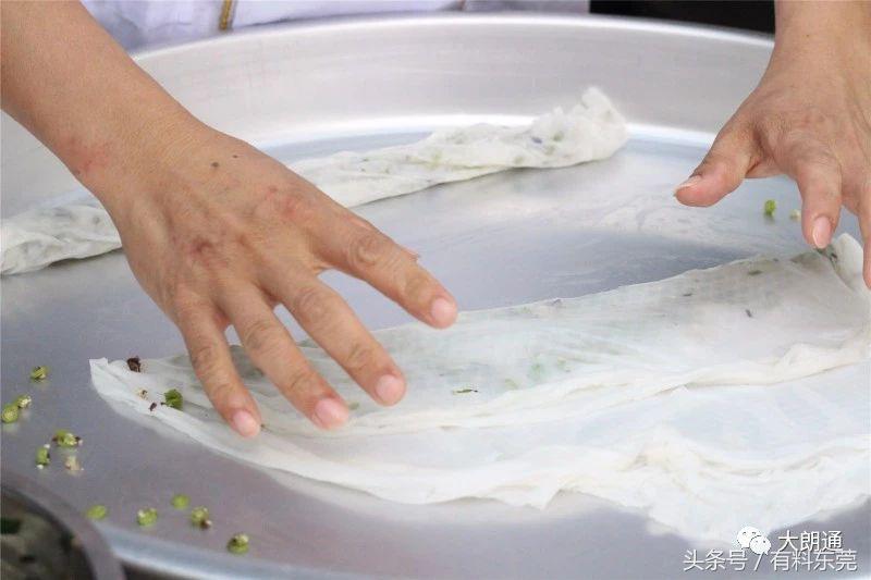 師傅把適量米漿倒入竹箕內(nèi)馬上攤開(kāi),手速快