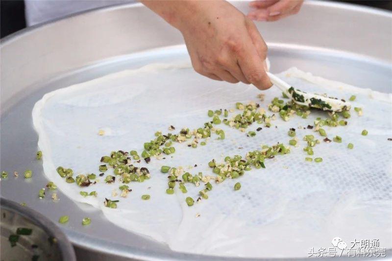 在晾制過(guò)的粉皮上灑上一些豆角、韭菜、肉末等餡料,接著卷成粉條,然后澆上花生油、醬油或者芝麻鹽就可以上桌了~