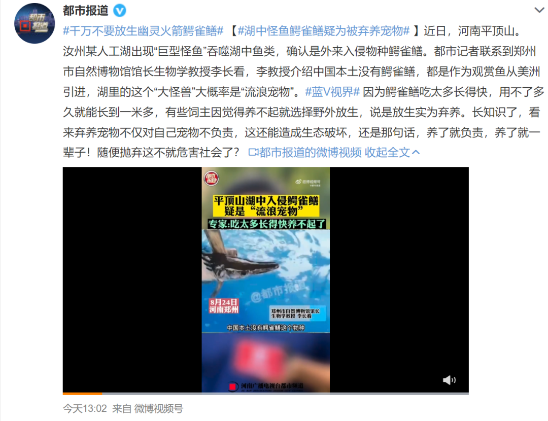 由于其體型巨大,搬運困難很多人將它悄悄放生至小區(qū)附近的河道或者湖泊殊不知,鱷雀鱔如同放虎歸山鱷雀鱔是吃爽了但本地魚群卻遭到了重創(chuàng)嚴重破壞生態(tài)平衡專家:疑為被棄養(yǎng)寵物鄭州市自然博物館館長生物學教授李長看介紹中國本土沒有鱷雀鱔都是作為觀賞魚從美洲引進湖里的這個“大怪獸”大概率是“流浪寵物”因為鱷雀鱔吃太多長得快用不了多久就能長到一米多有些飼主因覺得養(yǎng)不起就選擇野外放生說是放生實為棄養(yǎng)