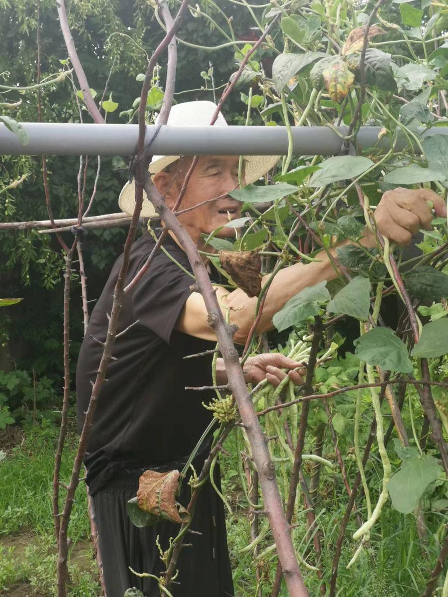 靠南墻的那片豆角地今年是下了功夫了,都給它們起了壟,搭了架。這么多天沒在家,豆角地里的草多了不少,豆角長得很好。那些豆角長長的,有的從架子上垂到地上,有的在架子上纏著。老伴順了一道架子已經(jīng)摘了一大捆了。我去摘的那些有的已經(jīng)老了,豆角皮起褶皺了,有的豆角開裂了,里面的豆角粒還是紅色的呢,不行就剝出來,晾干了,做明年的豆角種子。豆角也快要下市了,聽小女兒講,小張那邊的超市里還要兩塊多錢一斤呢!豆角地旁邊是今年春天種下的茄子,結(jié)出的是長茄子,也都熟透了,這時的茄子洗凈了生吃都有滋有味,炒的時候,火候要小,放一點紅糖,后撒一點蒜末,炒出來的茄子別一個風味。那個茄子低低地垂到了地上,發(fā)著紫色的油光,葉子擋著,不仔細看還看不到,是該摘了。