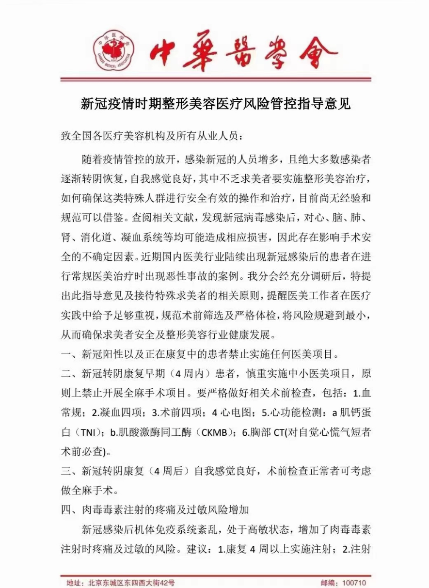 2023年1月1日,中華醫(yī)學(xué)會(huì)醫(yī)學(xué)美學(xué)與美容學(xué)分會(huì)發(fā)布《新冠疫情時(shí)期整形美容醫(yī)療風(fēng)險(xiǎn)管控指導(dǎo)意見》。指導(dǎo)意見提出,新冠陽性以及正在康復(fù)中的患者禁止實(shí)施任何醫(yī)美項(xiàng)目;新冠轉(zhuǎn)陰康復(fù)早期 (4周內(nèi))患者,慎重實(shí)施中小醫(yī)美項(xiàng)目,原則上禁止開展全麻手術(shù)項(xiàng)目,要嚴(yán)格做好相關(guān)術(shù)前檢查。
