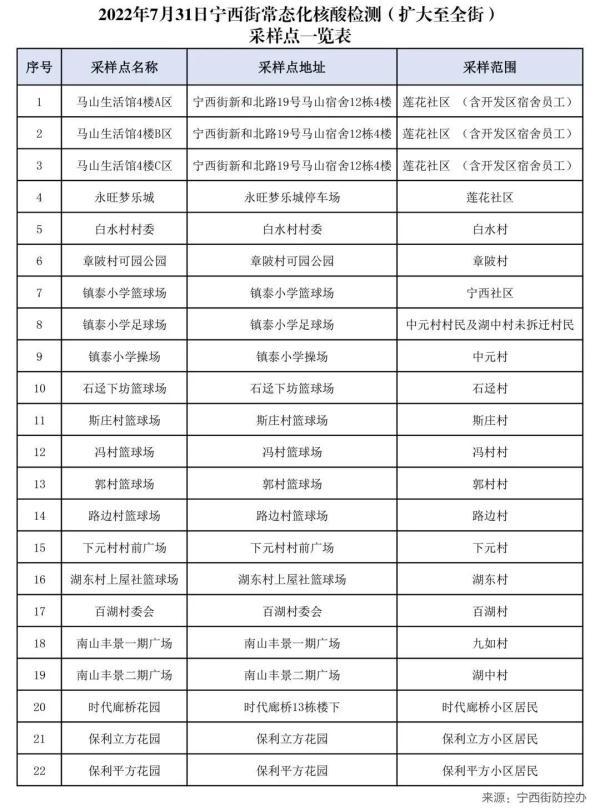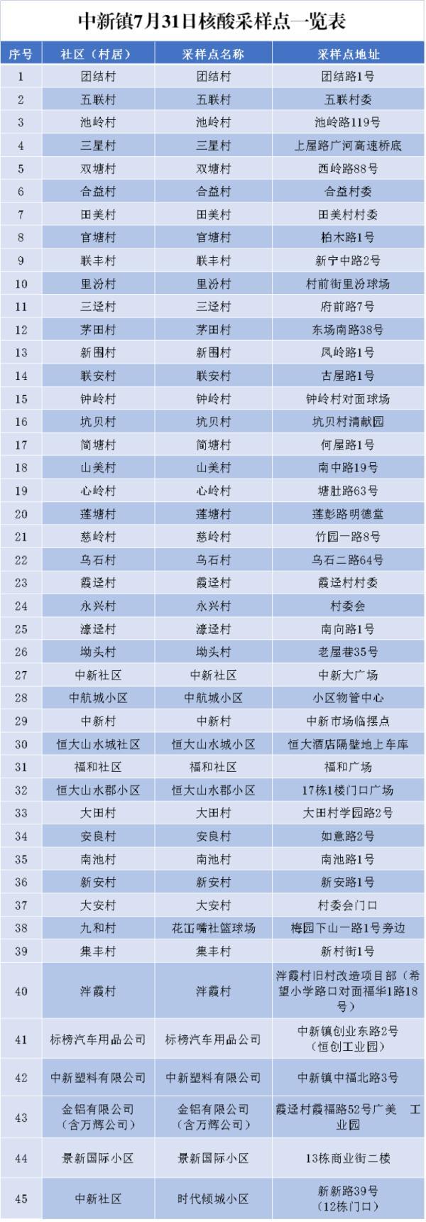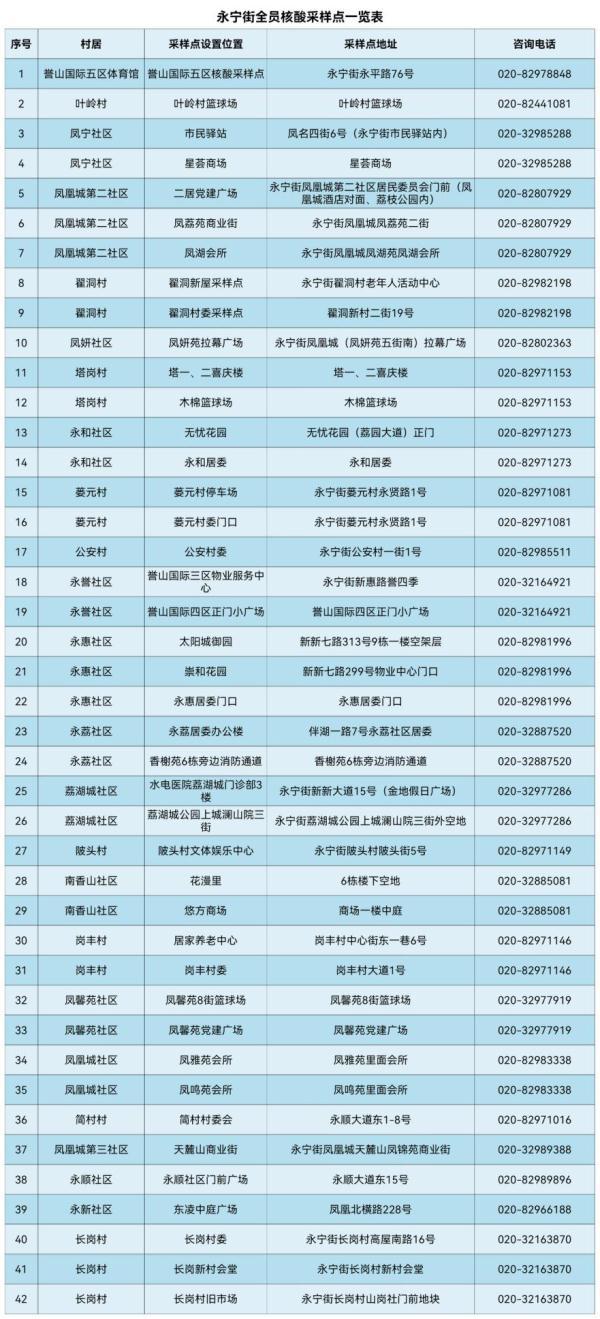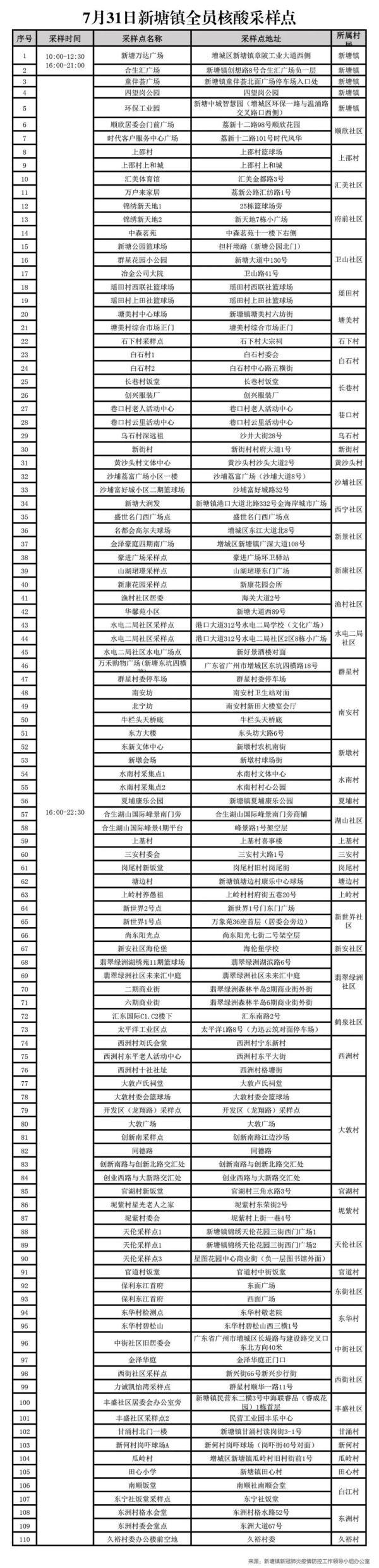 7月31日,廣州市增城區(qū)發(fā)布通告,在新塘鎮(zhèn)、永寧街開展全員核酸檢測,寧西街、中新鎮(zhèn)開展常態(tài)化核酸檢測(擴(kuò)大至全街、鎮(zhèn))檢測。具體檢測點(diǎn)如下: