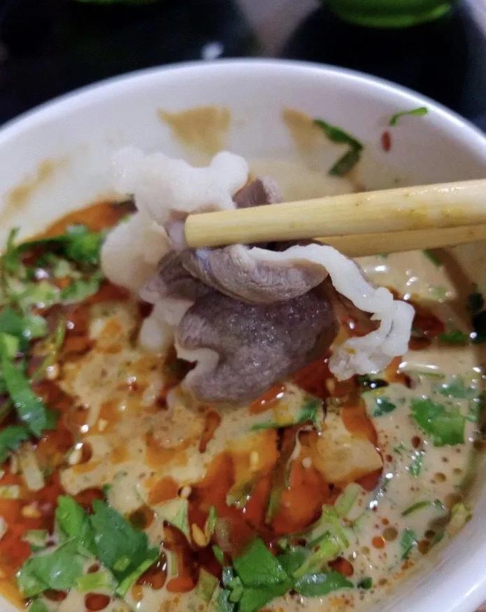 分量的話中規(guī)中矩,屬于厚切羊肉比較有質(zhì)感,大塊的肉吃起來有點塞牙,小塊的還挺嫩,麻醬里面還有蔥、香菜,十分符合大頭我的胃口!服務員會一直來加湯,氣氛挺好的~