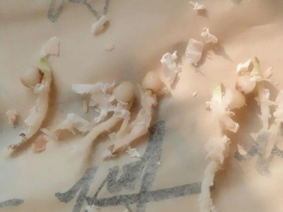 種子取下來后,要剝殼、去除包衣,然后浸泡一半在水里催芽,也可以放在濕潤的木屑、水苔里催芽,像下圖這樣的大豆芽就可以了。