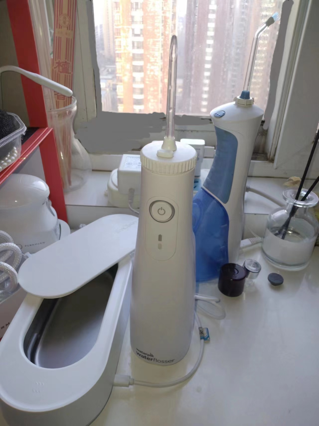 超聲波清洗器(左)和新的水牙線(中) 新款的是水箱更干凈、磁吸充電,價格差不多