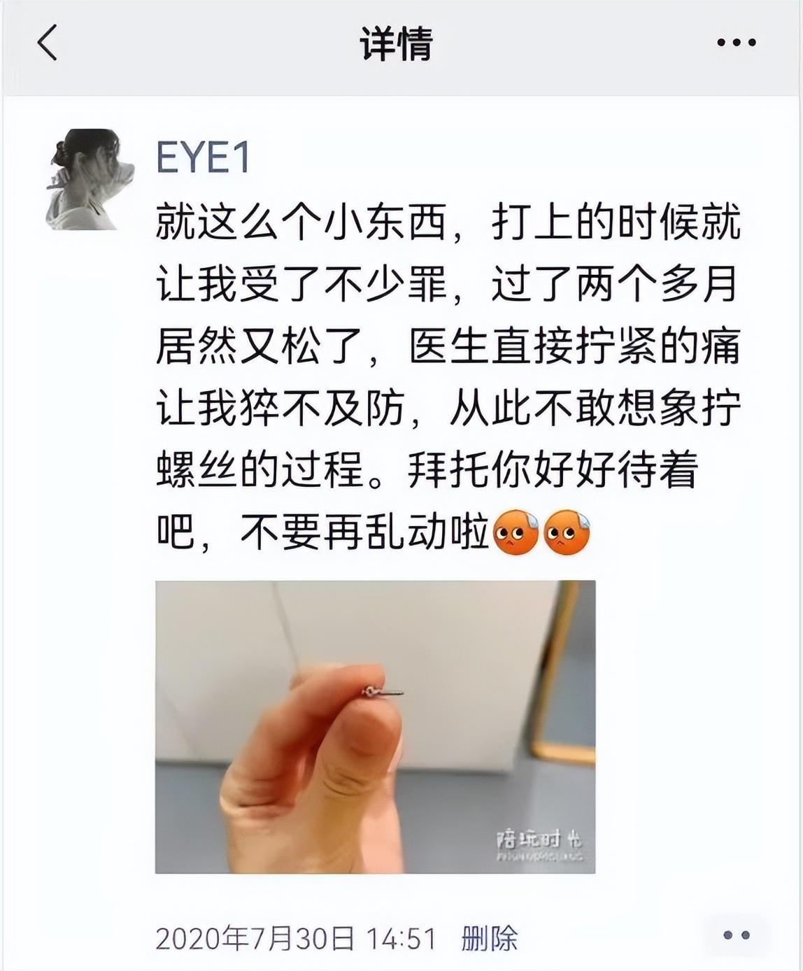 還有一些附屬小物,比如透明牙套只是固定形態(tài)的,為了移動牙齒,還需要皮筋助力,牙套上本身有個小豁口可以套住皮筋的一端,另一端固定在哪里呢?這就需要牙釘了。開始我也是拒絕的,但后來才發(fā)現(xiàn)不安不行,如果想要整牙,先想想自己的承受力吧。下圖是我當時發(fā)的朋友圈,不得不說,任何安裝進來的東西都是需要適應的,比如現(xiàn)在,我根本感覺不到牙釘?shù)拇嬖?,刷牙、吃東西等等,都沒啥問題,但在當時,還的確是受了罪的。