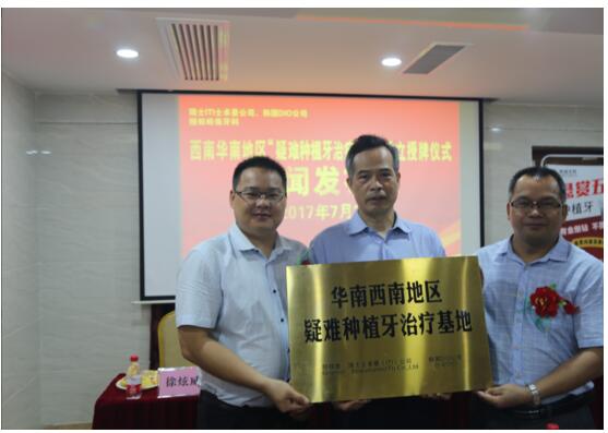 上午9點,華南西南地區(qū)疑難種植牙調(diào)節(jié)基地成立揭牌儀式暨新聞發(fā)布會在熱烈的氣氛中進(jìn)行。瑞士ITI士卓曼公司代表黎斌同、韓國DIO種植體公司代表徐炫威、嶺南牙科院長潘蛟南發(fā)表講話。隨后,瑞士ITI種植體公司、韓國DIO種植體公司、嶺南牙科共同完成授牌交接和揭牌儀式,標(biāo)志著華南西南地區(qū)疑難種植牙調(diào)節(jié)基地在嶺南牙科正式成立。