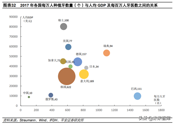 患者的消費(fèi)能力和醫(yī)生數(shù)量是制約種植和正畸滲透率提升的主要因素。以種植為例,我國種植牙滲透率較低,每萬人種植牙數(shù)量僅10個(gè),而世界主要的平均水平大概在100左右。分析發(fā)現(xiàn),種植牙滲透率主要跟消費(fèi)能力和種植醫(yī)生數(shù)量兩個(gè)因素有關(guān),前者代表支付能力,后者代表服務(wù)供給能力。韓國每萬人種植牙數(shù)量高達(dá)622個(gè),主要是由于2014年開始牙科保險(xiǎn)覆蓋更多的高端人群。此外,在韓國70%以上的牙醫(yī)都能開展種植手術(shù),而我國這一比例偏低。巴西雖然人均GDP與我國在同一水平,但由于其龐大的牙科醫(yī)生數(shù),導(dǎo)致種植醫(yī)生數(shù)量多。