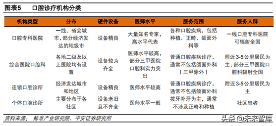 目前我國口腔醫(yī)療服務(wù)提供方主要有4個(gè),分別是口腔??漆t(yī)院、綜合醫(yī)院口腔科、連鎖口腔診所、個(gè)體口腔診所。其中以口腔??漆t(yī)院水平高,通常位于一線城市或省會(huì)級城市,設(shè)備精良,擁有大量知名專家,服務(wù)內(nèi)容全,服務(wù)范圍可輻射全國,代表如華西口腔醫(yī)院、北大口腔醫(yī)院等,2017年我國口腔??漆t(yī)院共有689家;我國二級及以上醫(yī)院均設(shè)有口腔科,通常設(shè)備較為齊全,醫(yī)師水平較高,服務(wù)內(nèi)容主要為常見口腔疾病,服務(wù)人群為附近3-5公里居民。但也有一些大型三甲醫(yī)院口腔科水平突出,可開展高難度口腔疾病診療,服務(wù)范圍可至全國,如上海九院、北京協(xié)和等。目前我國擁有二級及以上綜合醫(yī)院8700家左右;此外,我國還存在大量口腔診所,以基本的“拔、鑲、補(bǔ)”等低水平診療行為為主。其中連鎖口腔診所設(shè)備相對精良,可開展正畸、種植等高附加值項(xiàng)目,輻射范圍也不局限于社區(qū)居民。