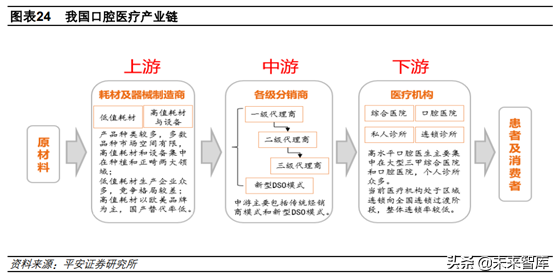 三、口腔產(chǎn)業(yè)鏈:上游關(guān)注高值耗材,下游重視連鎖化口腔醫(yī)療產(chǎn)業(yè)鏈主要分為上游、中游和下游。上游為耗材及器械制造商,口腔行業(yè)耗材產(chǎn)品種類多,主要分為低值耗材、高值耗材及設(shè)備。前者多數(shù)市場空間較小,且競爭格局差,后者目前仍以歐美品牌占主導(dǎo),國產(chǎn)替代率較低;中游目前在國內(nèi)口腔醫(yī)療產(chǎn)業(yè)鏈的占比較低,以傳統(tǒng)的各級經(jīng)銷商為主,但近年來國內(nèi)開始逐漸出現(xiàn)新型的DSO模式;下游就是各類口腔醫(yī)療服務(wù)機(jī)構(gòu),如前文所述,主要包括綜合醫(yī)院口腔科、口腔醫(yī)院、私人診所和連鎖診所四大主要類別。當(dāng)前我國口腔醫(yī)療機(jī)構(gòu)處于區(qū)域連鎖向全國連鎖過渡的階段,整體連鎖率較低。