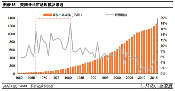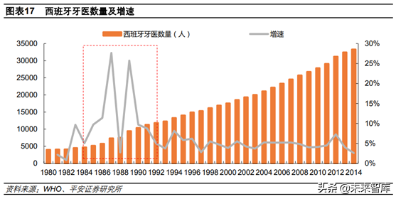 從歐美經(jīng)驗(yàn)來看,我國口腔醫(yī)療也到了快速發(fā)展的關(guān)口。美國牙科醫(yī)療消費(fèi)市場規(guī)模在1967-1981年間增速快,CAGR達(dá)11.44%,在此期間人均GDP由4327美元提升到13943美元。而歐洲由于經(jīng)濟(jì)發(fā)展水平不同,口腔醫(yī)療爆發(fā)節(jié)點(diǎn)有所差異,我們以西班牙為例,其口腔醫(yī)療在1980年之后,尤其是1984-1992年之間快速增長,這段時(shí)間也是其人均GDP快速提升的階段,由4478美元提升至16086美元,CAGR達(dá)17.32%。因此,無論從臺(tái)灣,還是歐美發(fā)展經(jīng)驗(yàn)看,當(dāng)前我國經(jīng)濟(jì)發(fā)展水平足以支撐我國口腔醫(yī)療的快速起步。