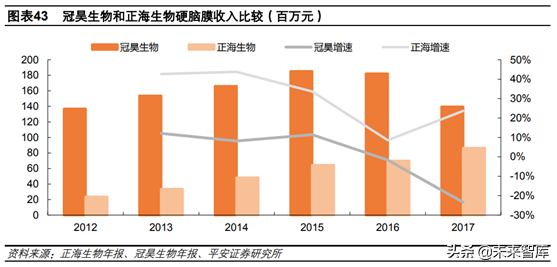 生物膜主要用于硬腦(脊)膜缺損的修復(fù)。該品種市場競爭較為激烈,國內(nèi)廠家主要有天新福、冠昊生物,進(jìn)口產(chǎn)品主要有強(qiáng)生和貝朗。目前天新福、冠昊生物和正海生物市占率居前三位,國外品牌相對靠后。國內(nèi)硬腦膜市場在50-60億,相對成熟,行業(yè)增速不到10%,前三家企業(yè)市場規(guī)模在10-15億。2017年正海生物硬腦膜銷售8631萬元,同比增長24%,而同期冠昊生物銷售1.4億元,同比下滑23.38%,我們預(yù)計(jì)正海生物市占率將逐步實(shí)現(xiàn)超越。未來腦膜競爭格局的改變主要依靠新材料的出現(xiàn),公司正在研發(fā)新一代生物膜,其上市后將加快對現(xiàn)有產(chǎn)品的替代。