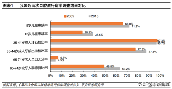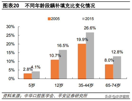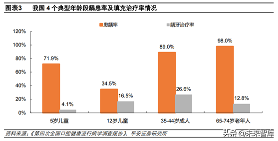 口腔疾病診療率低,發(fā)展?jié)摿薮蟆?/strong>“牙疼不是病”充分說明了在我國口腔問題長期不受重視,面對口腔問題一貫的做法是“忍一忍就過去了”,口腔健康觀念的落后導(dǎo)致我國口腔患者診療率低。根據(jù)口腔流行病學(xué)調(diào)查結(jié)果,5歲兒童、12歲兒童、35-44歲成人、65-74歲四個(gè)年齡段齲齒填充調(diào)節(jié)率僅分別為4.1%、16.5%、26.6%、12.8%,四個(gè)年齡段調(diào)節(jié)率均遠(yuǎn)遠(yuǎn)小于齲患率。