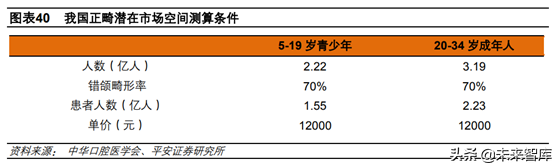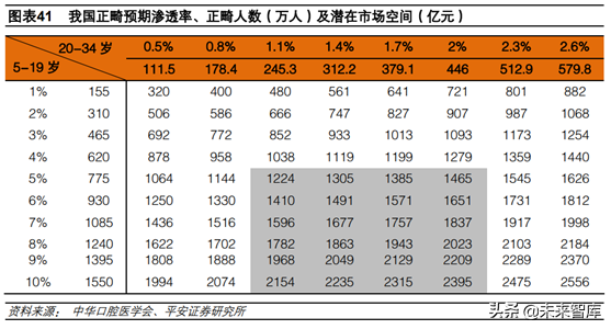 我國正畸市場潛在市場空間在2000億元以上:1)2000年中華口腔醫(yī)學(xué)會(huì)正畸專業(yè)委員會(huì)調(diào)查得知我國錯(cuò)頜畸形整體患病率為67.82%,較上世紀(jì)60年代提升30%-40%,呈上升趨勢。我們假設(shè)當(dāng)前我國錯(cuò)頜畸形患病率在70%左右;2)正畸通常有兩個(gè)年齡段,一是5-19歲的青少年,二是20-34歲的成年人,35歲以后正畸病例較少。目前我國正畸病例200萬例左右,參照我國5-19歲和20-34歲兩個(gè)年齡段3.78億的潛在患者人數(shù),滲透率僅約0.5%;3)正畸客單價(jià)按12000元計(jì)算。參考國外情況,我們保守估計(jì)5-19歲滲透率在5%-10%之間,20-34歲滲透率在1.1%-2%之間,則我國正畸市場潛在市場空間在1224億-2395億元之間,仍有5-10倍的成長空間。