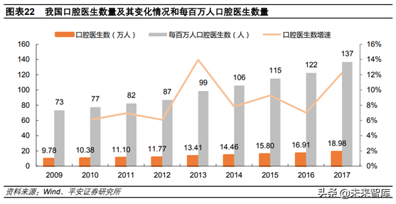 3)口腔醫(yī)生數(shù)量增長提速,醫(yī)療服務(wù)能力加強(qiáng)。2017年我國共擁有口腔科醫(yī)生18.98萬人,同比增長12.25%。每百萬人口擁有口腔醫(yī)生137人,相當(dāng)于臺(tái)灣地區(qū)1982年的水平,彼時(shí)臺(tái)灣口腔醫(yī)療行業(yè)剛剛起步。同時(shí),從2013年開始我國口腔醫(yī)生數(shù)量增速提升,服務(wù)能力持續(xù)增強(qiáng),為口腔行業(yè)騰飛奠定基礎(chǔ)。