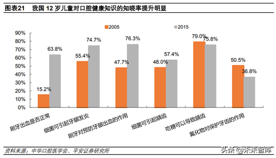 同時(shí)口腔從業(yè)者不斷進(jìn)行市場教育,我國居民口腔健康意識(shí)不斷提升,相關(guān)口腔健康知識(shí)的普及得到顯著提升。如12歲兒童對“刷牙出血是否正?!?、“細(xì)菌可引起牙齦發(fā)炎”、“刷牙對預(yù)防牙齦出血的作用”、“細(xì)菌可引起齲齒”等知曉率有提高。
