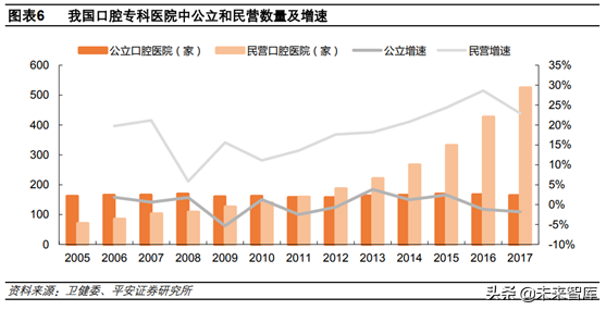 民營口腔??漆t(yī)院數(shù)量增速高于公立。2017年底我國689家口腔??漆t(yī)院中,公立口腔醫(yī)院有164家,2005年以來數(shù)量基本穩(wěn)定;2017年民營口腔醫(yī)院為525家,同比增長22.95%,2014年后增速始終在20%以上,保持蓬勃發(fā)展。民營口腔醫(yī)院數(shù)量快速增長,一是由于我國口腔醫(yī)療需求持續(xù)提升,公立醫(yī)院難以滿足;二是近幾年政策出臺(tái)頻繁,鼓勵(lì)社會(huì)資本進(jìn)入口腔等領(lǐng)域,同時(shí)允許執(zhí)業(yè)醫(yī)師多點(diǎn)執(zhí)業(yè)等等;三是口腔醫(yī)院通過開展正畸、種植等高附加值診療項(xiàng)目,整體利潤率高,在所有??漆t(yī)院中僅次于眼科醫(yī)院,吸引社會(huì)資本進(jìn)入。