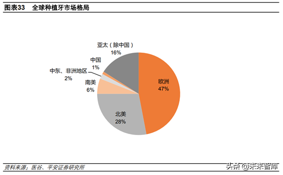 我國種植市場僅占1%。由于我國當(dāng)前種植牙滲透率較低,種植市場規(guī)模僅占的1%左右。而歐洲和美洲憑借較高的滲透率,占比分別高達(dá)47%和28%。