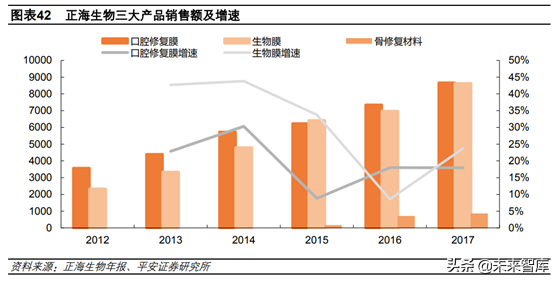 正海生物是國內(nèi)生物再生材料領(lǐng)域龍頭,主要有三大產(chǎn)品,分別為生物膜、口腔修復(fù)膜和骨修復(fù)材料,重點(diǎn)應(yīng)用于神經(jīng)外科、口腔科和骨科。其中口腔修復(fù)膜和骨修復(fù)材料應(yīng)用場景之一就是種植牙,我國大概有一半的種植牙患者存在骨量不足的情況,需要添加骨修復(fù)材料,而口腔修復(fù)膜則是用于口腔軟組織淺層缺損的修復(fù),兩者可配合使用。2017年公司生物膜、口腔修復(fù)膜和骨修復(fù)材料分別實(shí)現(xiàn)銷售額8631萬元、8671萬元和839萬元,分別同比增長23.71%、17.96%和21.95%,保持高速增長。2017年三大產(chǎn)品占收入比例高達(dá)99%。